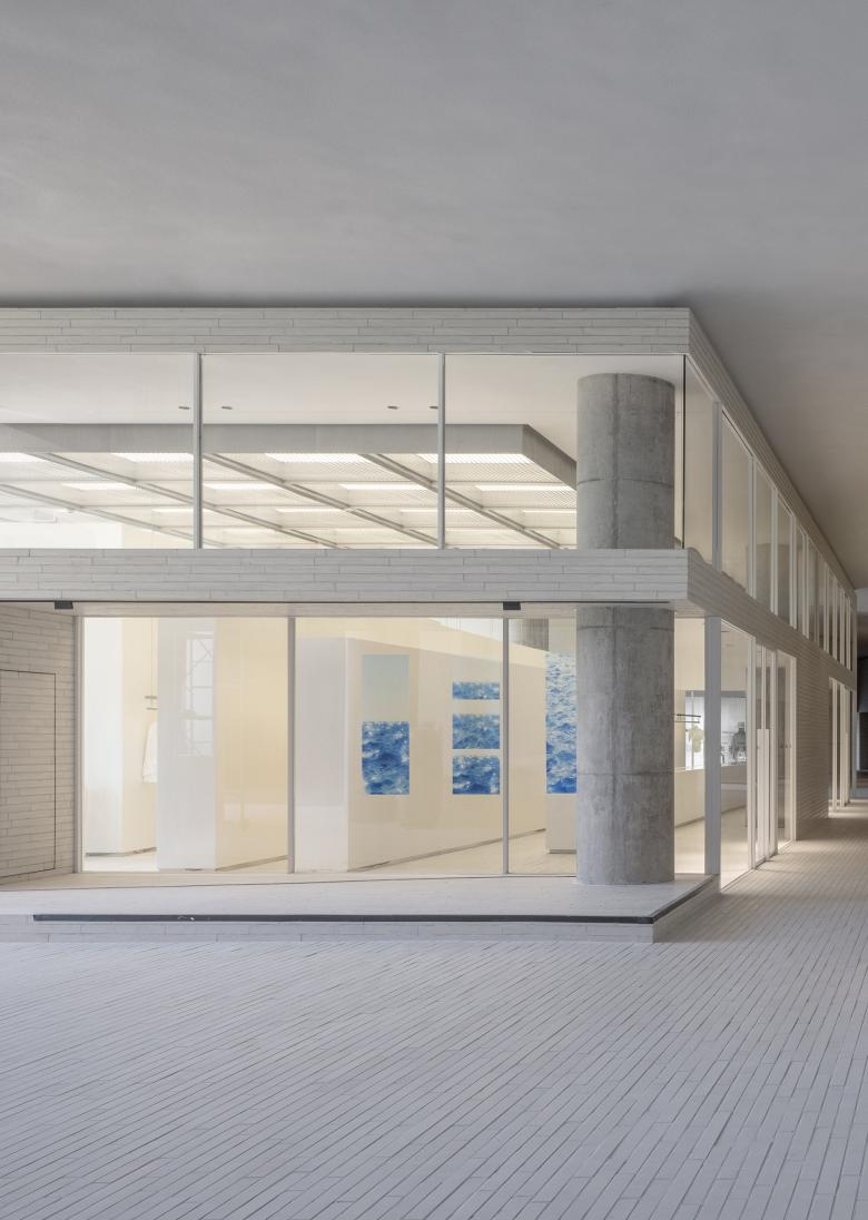 A newly built staircase enhances the interaction between the ground floor and the first floor, with its pure form echoing the art gallery.