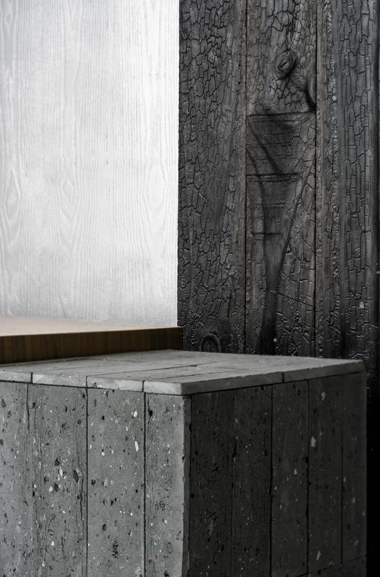 The traditional material silver foil was not applied to large areas of the space. Instead, it was attached to wooden veneers to form an updated version of "silver foil" that features wood grain. It neutralizes the sense of solemnity and rationality generated by charred wood and the orderly matrix of the ceiling, while also adding a soft and warm touch to the entire space.