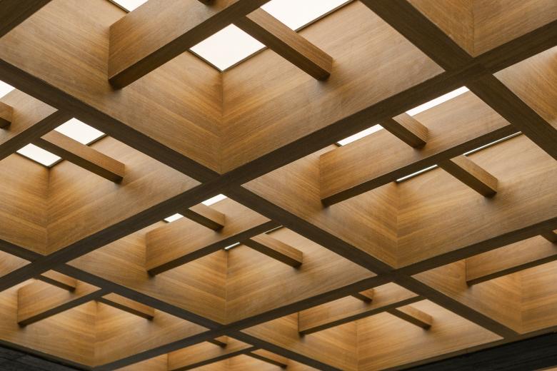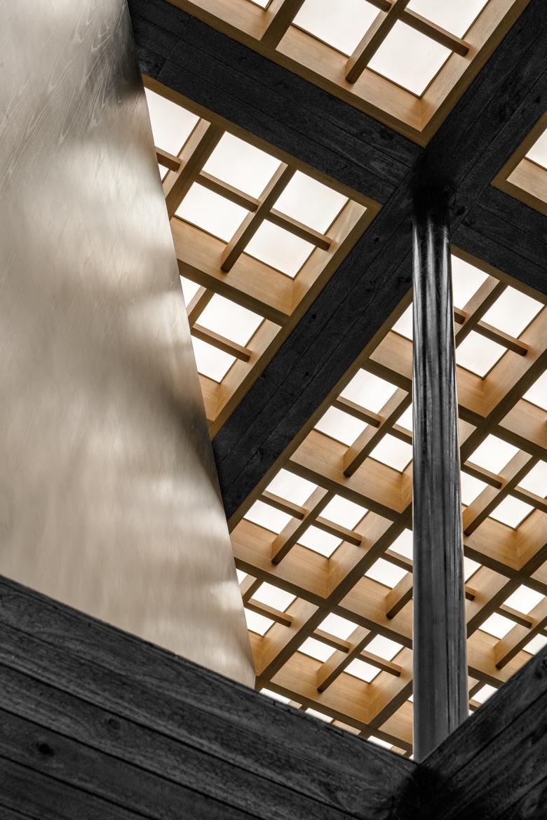 The design team retained the original structural beams in the middle of the atrium, and endowed them with unique natural rustic textures of charred wood. The beams, together with the orderly wooden ceiling grid, generate a Chinese-style yet modern spatial quality, a sense of ritual and unique structural characteristics.