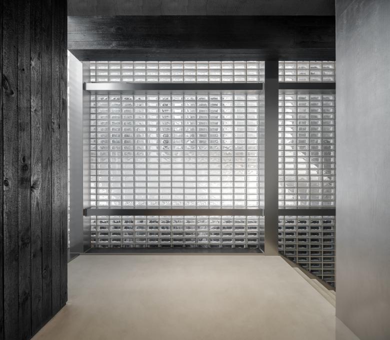 Parts of interior surfaces are composed of translucent glass bricks, which reveal outdoor hues indistinctly and help unify the spatial languages via the rational cross patterns.