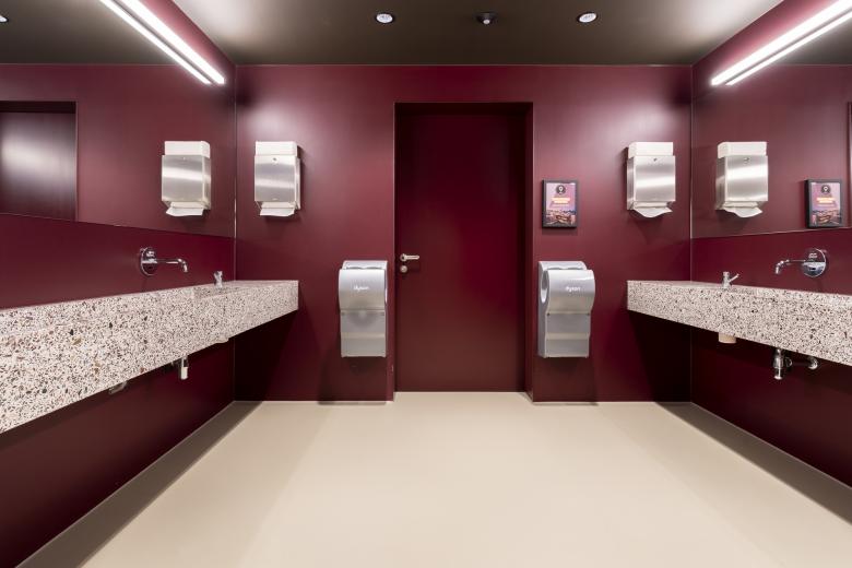 In den einzelnen Nasszellen überzeugt neben den Brünneli auch unser PUROLISS® Boden- und Wandbelag. Die spezielle Verrucano Farbe, dunkles Weinrot, verleiht dem besonderen Baustil seine elegante Note. Der Kontrast zum Terrazzobelag passt hervorragend.