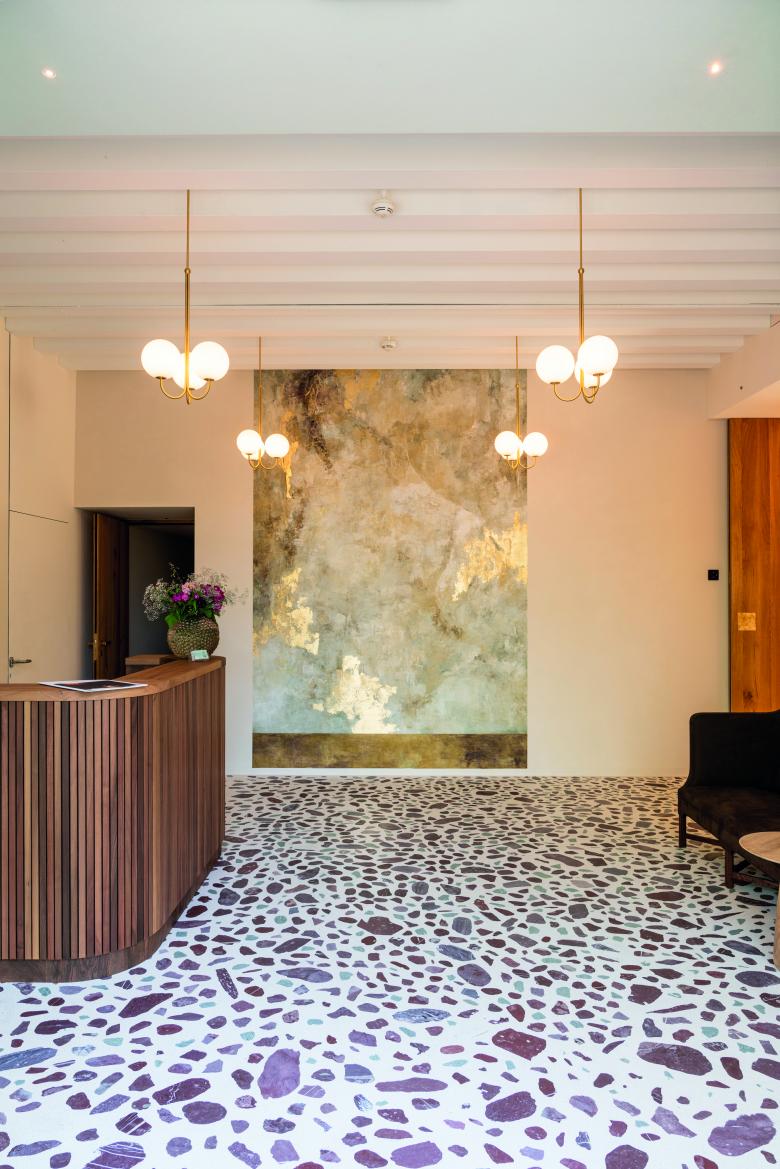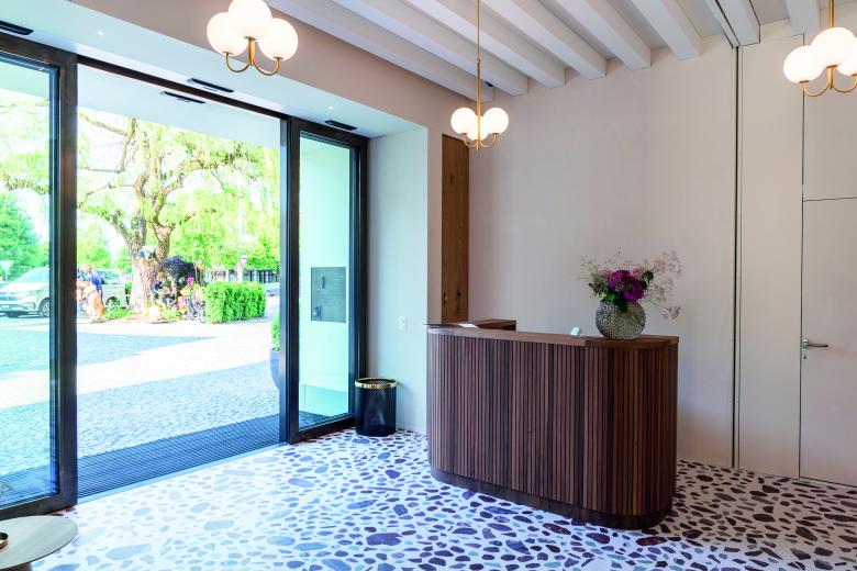 Die verwendeten natürlichen Materialien im Innen- und Aussenbereich bilden eine Oase der Entspannung. Unser traditionelle SURFATEX® Terrazzobelag besticht in seiner Einzigartigkeit und seinen erstaunlichen Möglichkeiten. Hier wurden bestimmte Regionen der Schweiz aufgesucht, um genau deren Urgestein zu bergen und zu bearbeiten, welche die Bauherrschaft wünschte. Der dazwischen ausgefüllte helle Zement bringt die Farben erst richtig zum Leuchten. Die Oberflächen sind glattgeschliffen und transparent versiegelt, somit lässt sich der Bodenbelag auch sehr gut reinigen und der Terrazzo bleibt lange beständig.