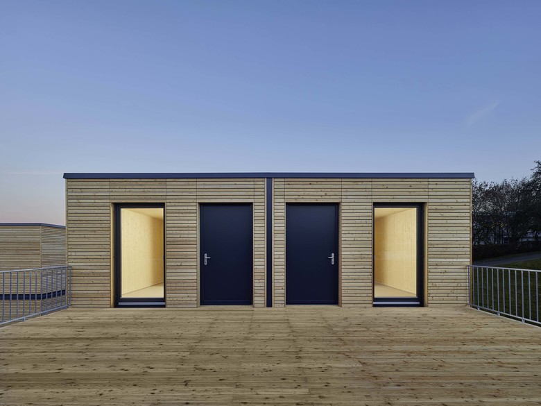 Built using the timber frame construction method, the aktivhaus modules were stacked to a height of two storeys on a gently rising plot of land that enjoys views of the neighbouring vineyards. As well as adapting the development to the topography of the site and the urban setting, it was also vital to design the exterior spaces in such a way that would make the areas surrounding the properties just as pleasant for residents to spend time in as the interiors of the structures themselves. The modules are intended to be used for approximately 3 years to provide longer-term accommodation for refugees fleeing the Syrian civil war. They can easily be converted to serve as social housing at the end of this period by carrying out a handful of internal modifications. As well as the residential units themselves, the housing development includes a technology module, two community rooms and a multifunctional space that contains such equipment as washing machines and dryers.