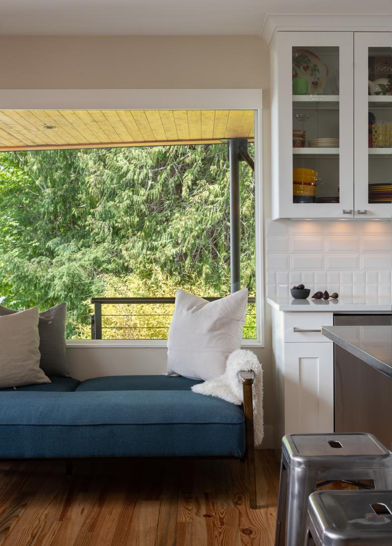 The clients, both grandparents and retirees, wanted a place of retreat and welcome. “Like many northwest families, that meant designing various indoor and outdoor spaces for their children, future grandchildren, neighbors, and friends,” says Wittman. The new wings of the house create a layering of community and privacy through guest bedrooms for friends, a bunk room and play area for kids, and an outdoor kitchen and deck for communal meals with neighbors. Two additions extend out of the original structure to meet this need – shaping shared spaces alongside rooms for reflection and privacy. Two decks seamlessly elongate the use of the adjacent spaces for encouraging late-night conversations next to an outdoor kitchen.