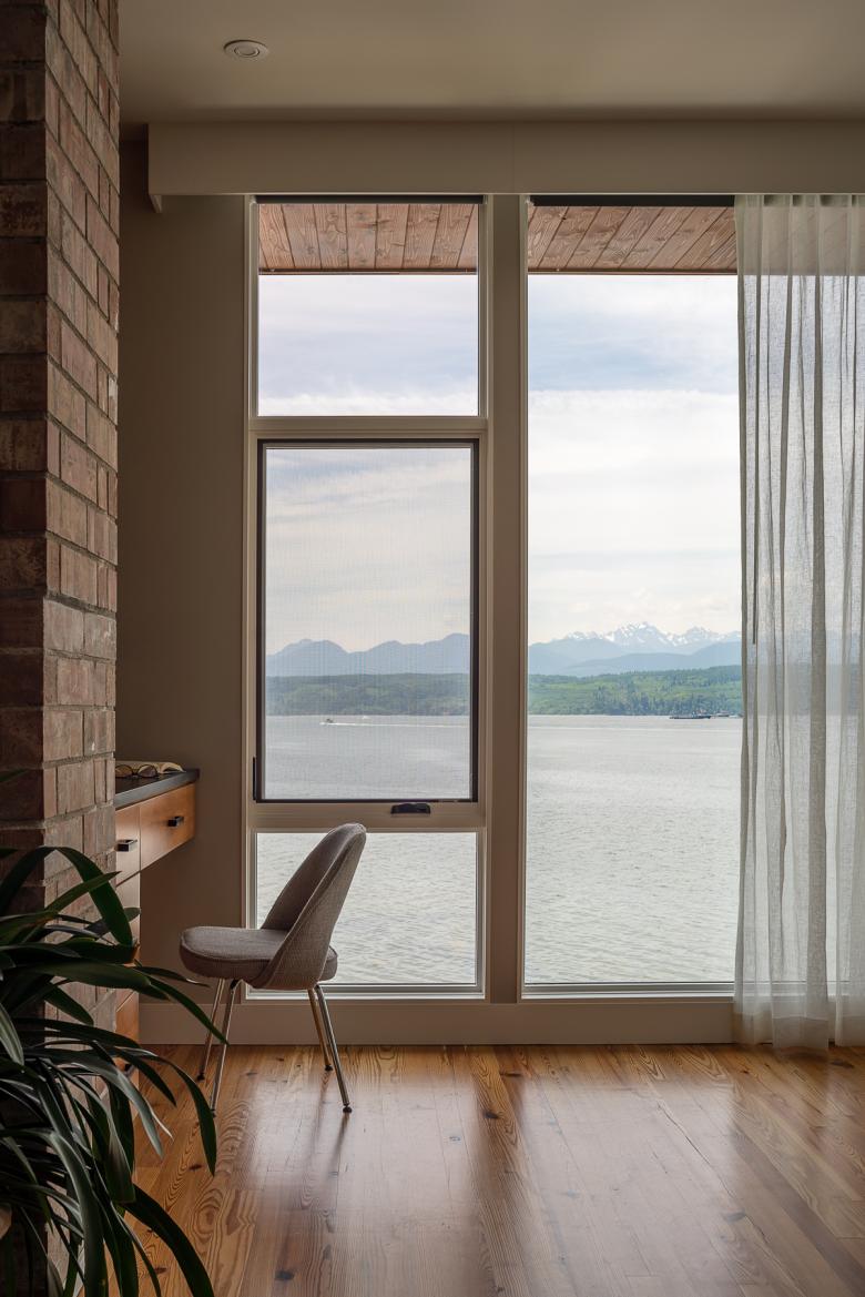 The original structure interplays throughout. Reclaimed pine flooring draws the Olympic forest to the interior. The existing brick chimneys blend into this palette, evoking timelessness and strength, representing the unique transformation of the house. The adaptive reuse of the Aldo Beach House sought a careful integration of the familiar with the modern, bringing the old and new together on the shoreline of Hood Canal.