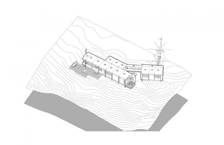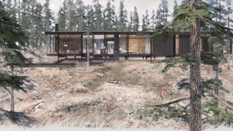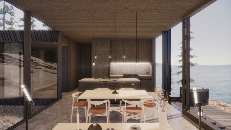 The careful arrangement of the program considers the delicate rocky ecology of the steep shoreline and the difficulty of getting typical construction machinery to the site. The house will be prefabricated offsite at a shipyard in Ballard, a waterfront neighborhood in Seattle. Grid-ordered steel frames are designed as on a 12-foot rhythm, based on the width of the house and the weight limitations needed for transport. The modules will be delivered by sea via barge and lifted onto its minimal, point foundation system with a helicopter.
