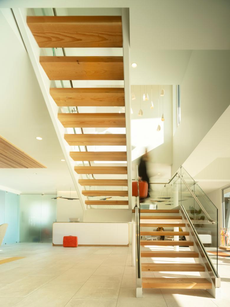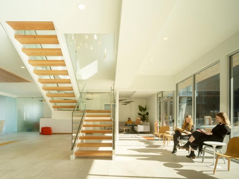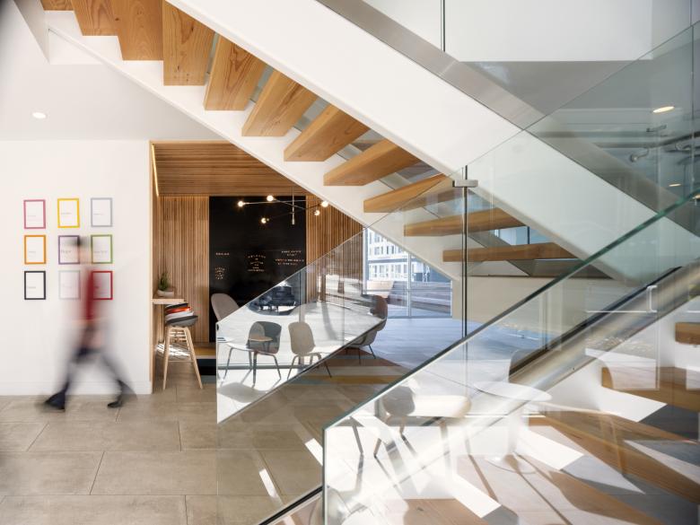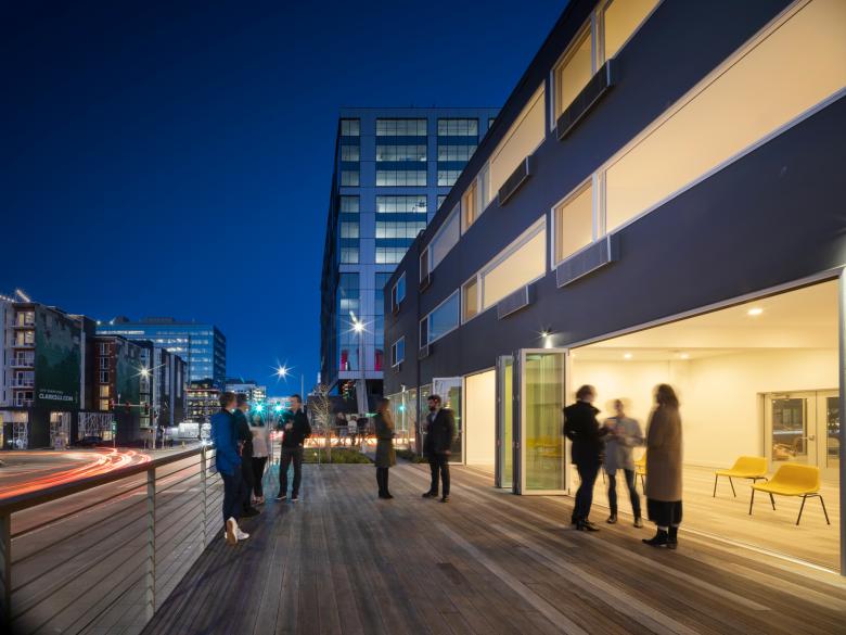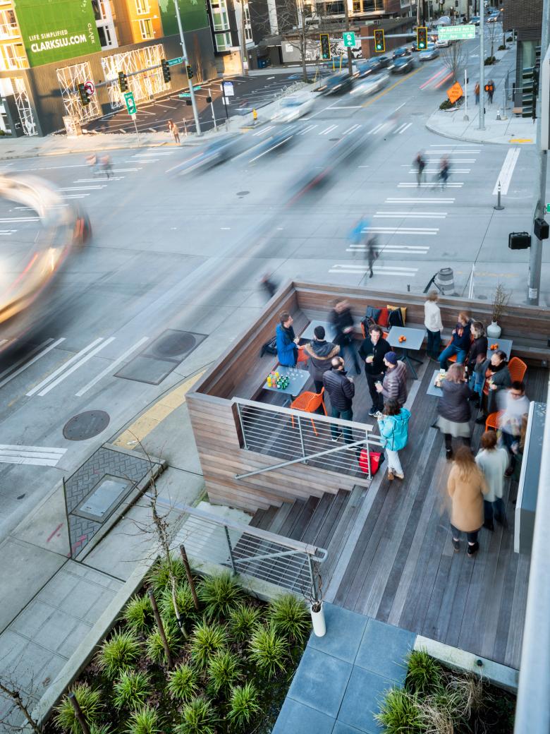 The renovated lobby features a new glass staircase with floating Douglas fir treads which bring guests to the upper level guest rooms. A new 1,000-square-foot ground level meeting room and event space can be partitioned into smaller rooms with sliding panels, or open up for one large event. A coffee shop is slated to open on the northeast corner of the lobby, with doors opening out onto a wood deck featuring built-in seating. On the hotel’s exterior, Wittman Estes worked with Noble Neon to create a new iconic neon sign that is visible from southbound SR99 and the surrounding neighborhood. At the hotel’s now pedestrian-friendly corner, a new 1,200-square-foot hardwood ipe deck and event space open the hotel up to the sidewalk, affording views north to the Lower Queen Anne neighborhood, Gates Foundation headquarters, and the Space Needle beyond. The entire lower level north façade of the building now features La Cantina folding doors which fully connect the event space to the outdoor deck.