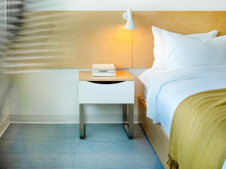 On the upper two levels, the guest rooms are accessed via brightly painted yellow doors, balancing the necessity of a memorable interior with the need for a cool, sensory retreat. “The key to hotel rooms is to balance art and commerce,” says architect Matt Wittman. “We wanted to select materials that will last for a long time yet still bring a sense of luxury with them.” Wittman Estes also custom designed plywood furniture to echo the hotel’s mid-century history and bring a sense of warmth to each guest room. The custom furniture pieces include the bed headboard, nightstands, desk, credenza, and storage cabinet.
