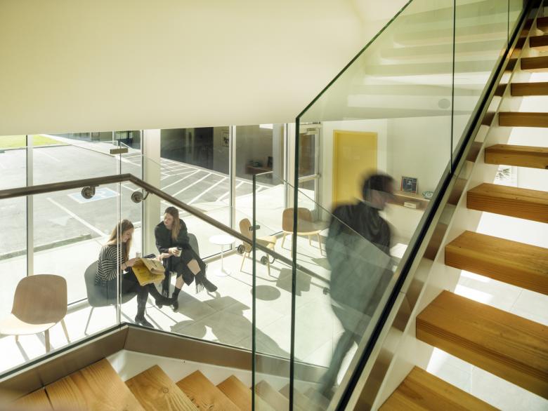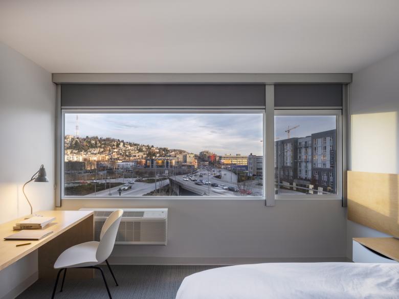 Standing three stories high, the transformed 27,433-square-foot building comprises 52 guest rooms. On the ground level is a lobby and event space, while on the second level are 26 guest rooms and a gym, and on the third level are additional 26 guest rooms. A rooftop Sky Lounge is planned for a future phase. The original hotel had been poorly renovated over the years, masking the original bones of the architecture and turning inward to avoid the noise of SR99/Aurora Ave. The existing lobby was dark and disconnected from both the surrounding cityscape and the guest rooms above. With the new tunnel placing the highway underground, the hotel owners sought to take advantage of the lower noise level and create an indoor-outdoor experience on the lobby level where the city's energy and pedestrian activity could be embraced by guests and travelers alike.