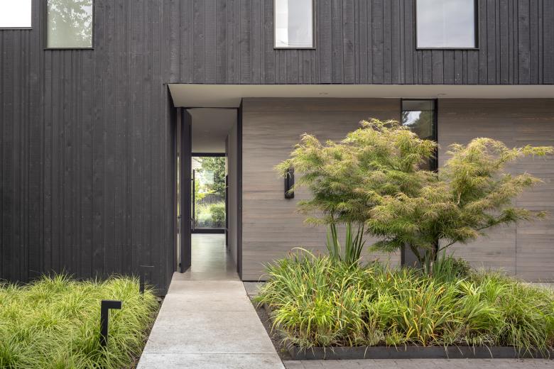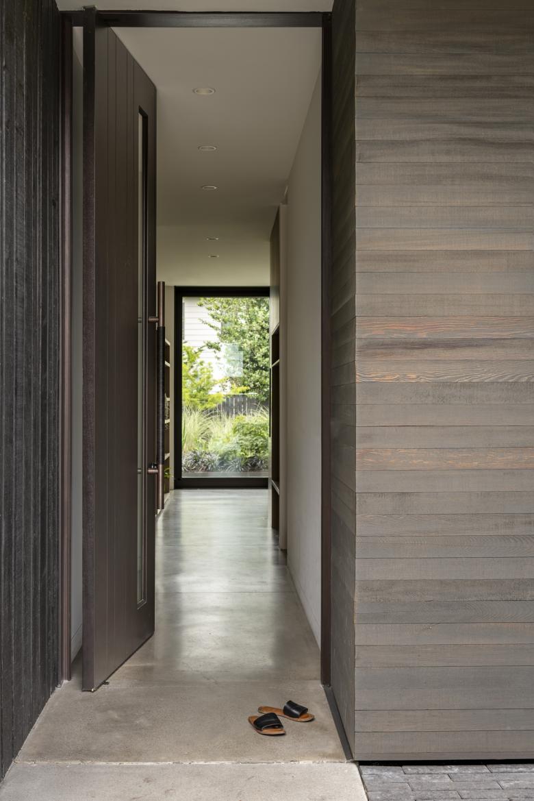 The design is organized in three elements: 1) the entry courtyard, which is screened from busy NE 24th Street; 2) the house living volume, which presents an opaque facade to the street, and a transparent facade to the rear; and 3) the garden courtyard, which is composed of a secluded zone in the rear yard where children can play freely. The courtyard house connects space with nature. The entry courtyard functions as a threshold between the street and the interior. A black-stained, tight knot cedar fence marks the next transition as a concrete path moves through a bed of grasses and a Japanese Maple tree. Inside the secluded garden courtyard, all signs of urban life disappear within the oak casement of the kitchen, concrete flooring, and floor-to-ceiling sliding doors.