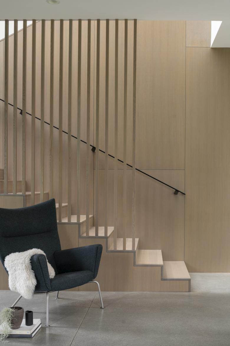 By creating the illusion of large spaces that seamlessly transition to outdoor views, the house used one third less of a footprint than was allotted. Chinese landscape paintings employ a “atmospheric perspective” technique to enhance the perception of depth of space. Yo-Ju uses this technique to create “visually larger spaces than what actually exist—the eye marks the level of oak stairs, then the large sliding doors, finally reaching the garden courtyard beyond,” says Matt Wittman. This spatial efficiency help shape a new model for suburban housing—a decreased footprint that allows for maximum energy savings and increased planting area, privacy, and views into nature.