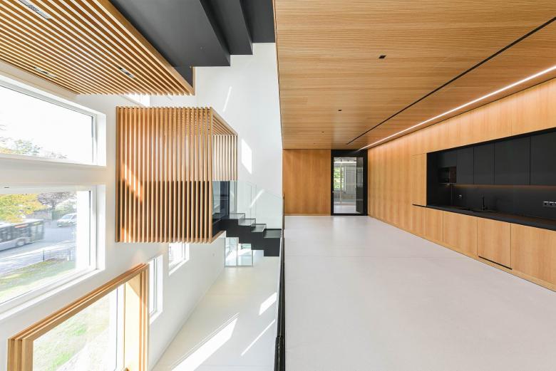 Die durch die Fensterrahmen bildartig in den Innenraum wirkende, bewegte Außenwelt schafft die inspirierende Umgebung für den wissenschaftlichen Austausch. Gleichzeitig öffnet sich der Innenraum nach außen in den Stadtraum und ermutigt das interessierte Publikum zum Betreten und Erleben des Forschungszentrums. Der Eingangshalle mit den Konferenzräumen lebt von einer reduziert-eleganten Atmosphäre, geprägt durch hellen Terrazzo, schwarze Wand- und Bodenbeläge und hochwertige Holz- und Glaselemente. Ein Kontrastprogramm erleben die Forscher:innen in den beiden hochmodernen Laboretagen, in denen sich jeweils eine auffällige, frische Farbigkeit in Blau oder Pink von Decken- und Bodenbelägen, über das Mobiliar bis hin zu den Sanitärbereichen zieht.