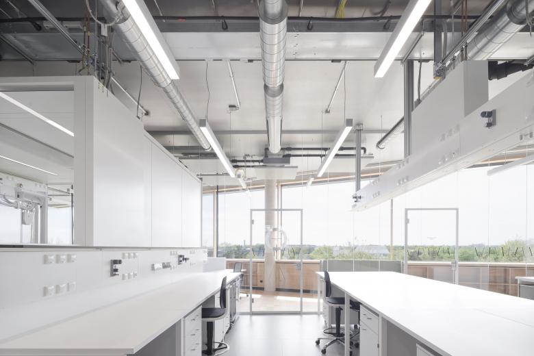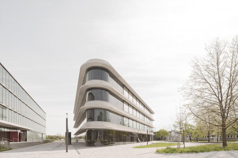 Die gesamte Gebäudestruktur basiert auf zwei spiegelbildlich angeordneten autarken Labormodulen, die an drei Seiten von variabel gestalteten Bürozonen eingerahmt sind. Im Zentrum befindet sich ein großzügiges Atrium mit Kommunikations- und Arbeitsbereichen, in dem Nutzungen über die Geschosse frei angeordnet wurden. Der Atriumsbereich ermöglicht es den Wissenschaftlern aus verschiedenen »Pioneer Groups« in unterschiedlichen Konstellationen und abwechslungsreichen räumlichen Situationen zu kommunizieren und zu recherchieren. Besprechungsräume und Areale für informelles Arbeiten und Präsentieren stehen den Nutzern an den spitz zulaufenden Gebäudeköpfen zur Verfügung. Zwischen ihnen und dem Atrium bilden die sogenannten Flex-Zonen einen flexibel gestaltbaren Übergangsbereich mit Labor- und Bürozonen. Die Labore lassen sich bedarfsgerecht durch Boxen abtrennen, die wie Labormöbel auf- und abgebaut werden.