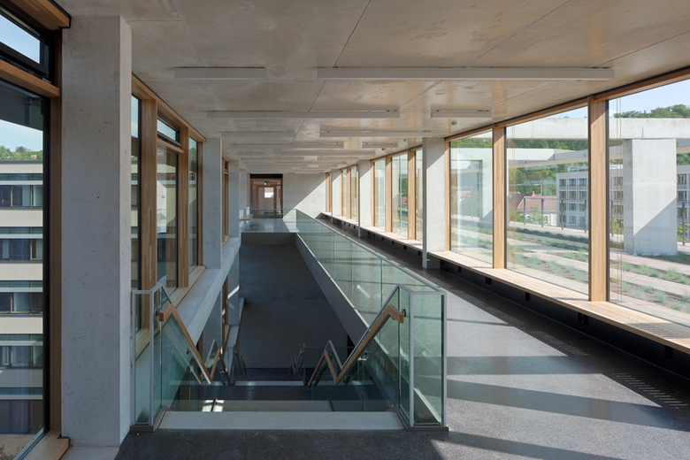 The double-loaded arrangement of the offices is accessed from a corridor running all the way round. The offices themselves are all designed for two people. The façades are developed as vertical relief enlivened by its three-dimensional quality and the alternating glazed and aluminium surfaces, increasingly tinted towards the top.