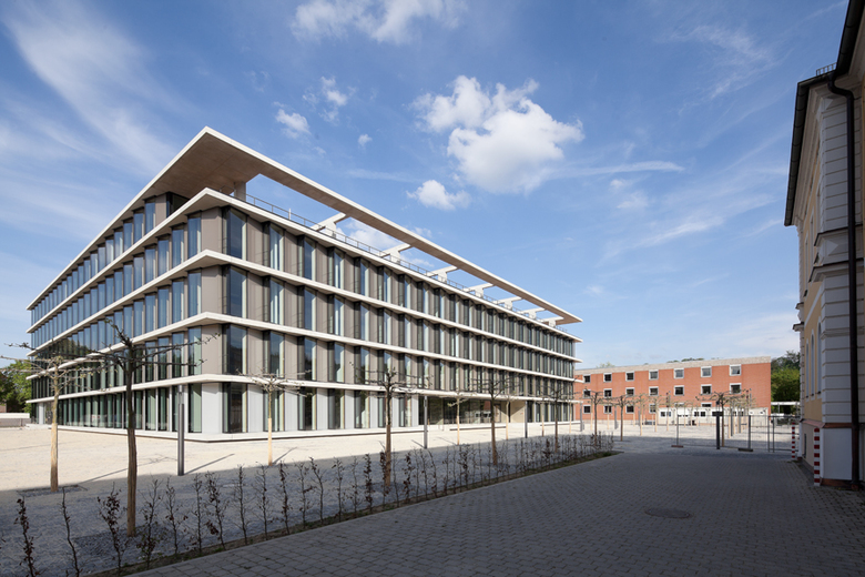 This administration building with offices, communal facilities such as cafeteria and training area for about 400 employees is in the immediate vicinity of Landshut old town. In front of it is a traffic-free forecourt that acts as a distribution area for the entrances to the adjacent office buildings. The building is in the courtyard style, and essentially has five storeys: a recessed section in the foyer area, roof loggias facing south and towards the old town and the detachment of one office section on the main access side for lavish vertical access are staged as subtractive interventions into the building volume. The transparent foyer makes visual contact possible between the forecourt and the inner courtyard. The latter is not open, and with its amorphous forms it represents the central internal reference point as a hortus conclusus.