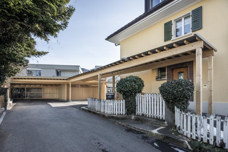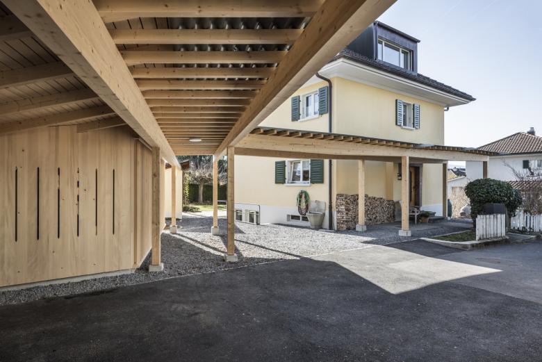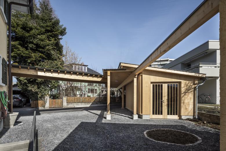 Geräteraum und Unterstand für Velos und zwei Autos.