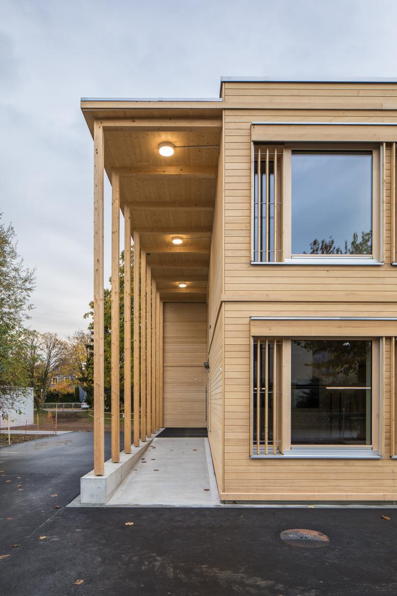 Auf dem Areal Schubertstrasse der Schule Seefeld entstand in dreizehn Monaten, von der ersten Skizze bis zur Fertigstellung, ein Schulraumprovisorium für drei Primarschulklassen. Die Dringlichkeit, die geplante Nutzungsdauer von fünfzehn Jahren und die Anforderung, danach das Schulhaus verschieben zu können, führten zu einem Elementbau mit roh belassenen Materialien und leicht industriellem Charme.
