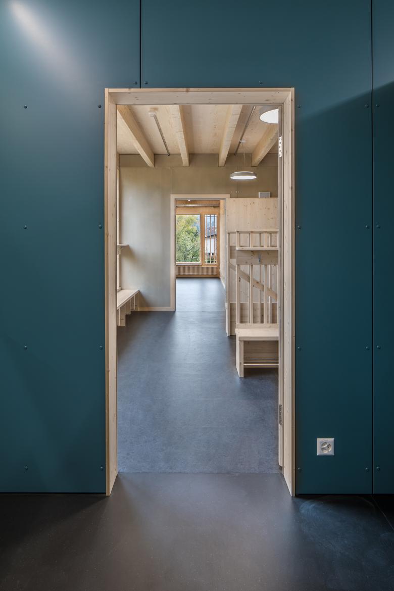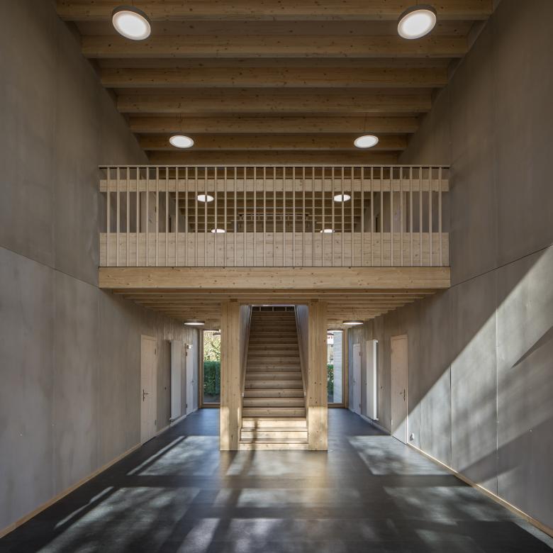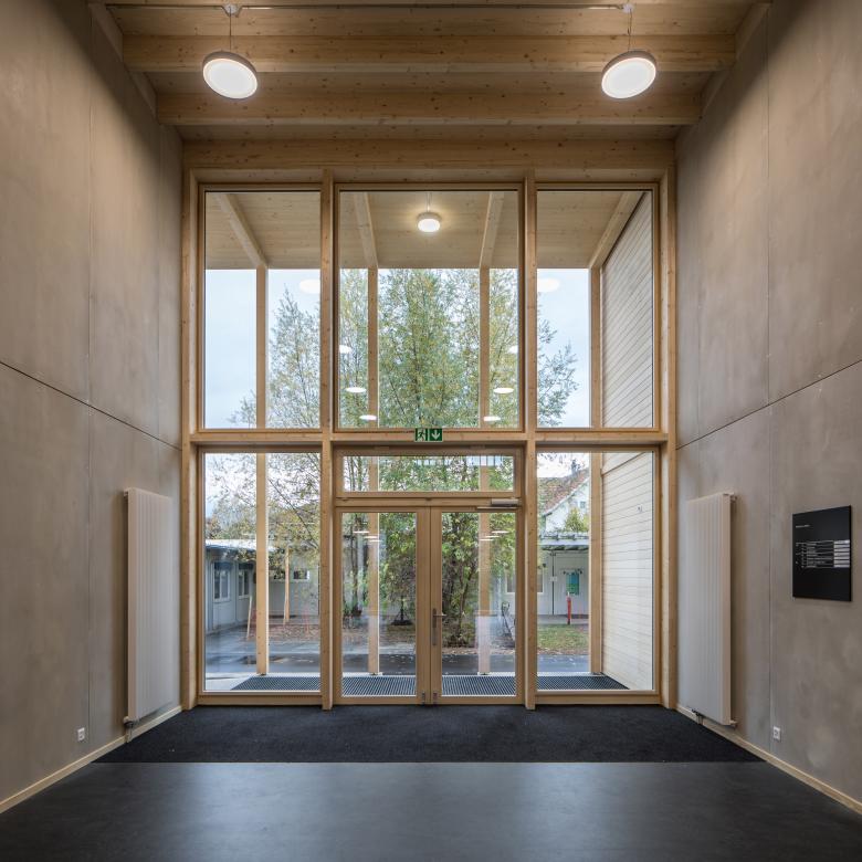 Der kompakte, zweigeschossige Baukörper aus Holz liegt etwas von der Schubertstrasse zurückversetzt und bildet auf drei Seiten Aussenräume mit unterschiedlichen Stimmungen. Eine hohe, zweiseitig belichtete Eingangshalle bildet die Mitte des Schulhauses. Sie dient ebenso als Garderobe, Erschliessungsfläche, gedeckte Pausenhalle und thermische Pufferzone. Die Wände und Decken der Räume zeigen ihre konstruktiv eingesetzten Mehrschichtholz- und Duripanelplatten ohne Oberflächenveredelungen. Das Zusammenspiel des dunkelrot-braunen Linoleumbodens mit dem rohen Holz erzeugt in den Schulzimmern eine warme, kreative Atelierstimmung.
