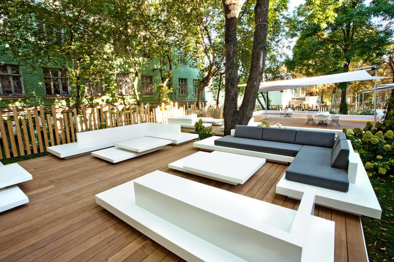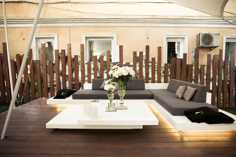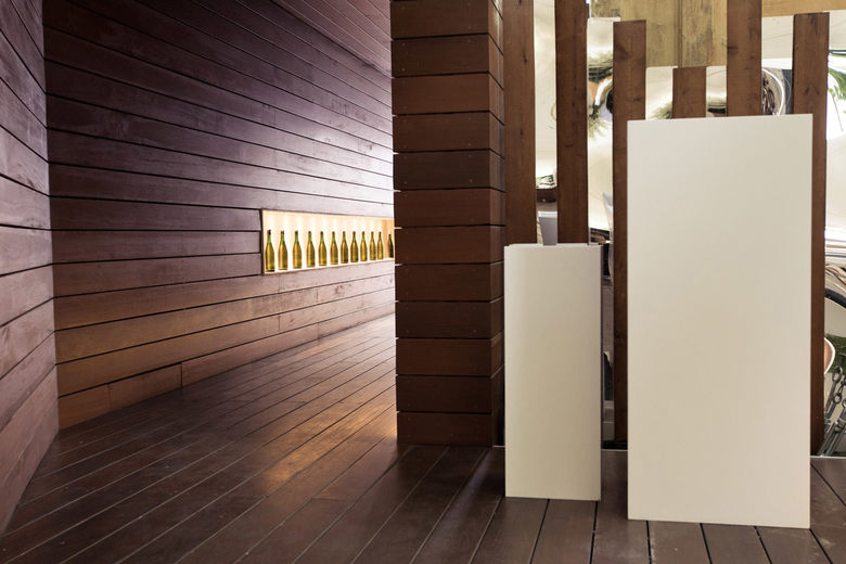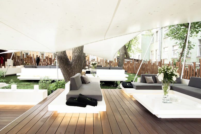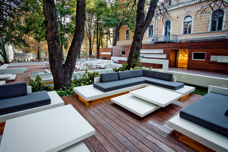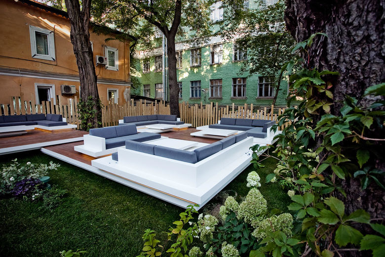 Die besondere Lage des Gartenrestaurants – eine Grünfläche, umgeben von historischer Bausubstanz im Zentrum von Kiew – und der alte Baumbestand mit seinem schützenden Blätterdach verleihen dem Ort eine unverwechselbare Atmosphäre. Diese Merkmale aufzugreifen und durch eine sensible Gestaltung noch stärker hervorzuheben stand im Fokus der Planung: Schwebende Ebenen, leichte Konstruktionen sowie klare, elegante Materialien prägen das Ambiente des Gartenrestaurants. Ein markant gestalteter Eingangstunnel aus Holz empfängt den Gast. So bleibt der Innenhof vollständig abgeschirmt von außen und es entsteht der Eindruck, man betrete eine andere Welt. Das Gartenrestaurant ist sowohl formal als auch im Hinblick auf die Materialwahl bewusst reduziert und schlicht gestaltet und bis ins Detail ausgearbeitet. Neben dem örtlichem Bezug, Formfindung und Materialwahl spielt auch das Beleuchtungskonzept für das besondere Ambiente eine entscheidende Rolle.