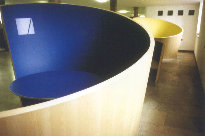 Der für 182 Studenten konzipierte Hörsaal im Mannheimer Schloss wurde im Rahmen des Projektes „Renaissance des Barockschlosses“ umgebaut. Wegen fehlender öffentlicher Mittel übernahmen Sponsoren die Finanzierung. Im Gegenzug kann der Hörsaal zur Präsentation des Unternehmens und letztlich auch zur Akquirierung zukünftiger Mitarbeiter genutzt werden. Diese speziellen Parameter waren maßgeblich für den Entwurf. Ein dynamisch gespanntes Lamellenband löst sich in Form und Materialität vom umgebenden historischen Rahmen und wird damit gleichermaßen zum Symbol für die Verbundenheit zu den ins Berufsleben startenden Studenten wie auch für den Zusammenhalt der Firmen innerhalb der Röchling-Holdinggesellschaft. In dem alten Schloss entsteht eine neue Dynamik, die das innovative Zusammenspiel von Studenten, Sponsoren und der Universität zum Ausdruck bringt.