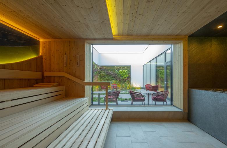 Das Obergeschoss umfasst eine großzügige Saunalandschaft mit fünf verschiedenen Saunen. Ein begrüntes Atrium sorgt für natürliche Atmosphäre, Tageslicht und hohe Aufenthaltsqualität. Ruhe- und Kaminzonen, ein Gastronomiebereich sowie ein Außenbereich mit Tauchbecken, Kaltduschen und Sonnenterrasse bereichern das Angebot. Im Dachgeschoss befindet sich zudem ein weiterer Ruheraum mit Ausblick auf die Umgebung.