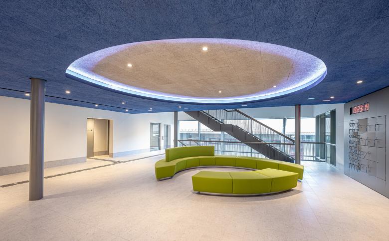In direkter Nachbarschaft zur Eissporthalle entwickelten 4a Architekten als Generalplaner einen dreigeschossigen Baukörper, der sich kompakt in die bestehende städtebauliche Struktur einfügt und den verfügbaren Raum effizient nutzt. Das Main Bad umfasst rund 900 Quadratmeter Wasserfläche für Freizeit, Sport und Erholung. Der Entwurf zeichnet sich durch eine klare, reduzierte Formensprache aus. Geschmeidige Rundungen und ein Fassadeneinschnitt im Eingangsbereich verleihen der dreieckigen Gebäudeform Dynamik. Im Innenraum dominieren Fliesen, verputzte Flächen und akustisch wirksame Oberflächen, die nicht nur gestalterisch ruhig wirken, sondern sich auch besonders gut reinigen und Instand halten lassen. Das Farbkonzept setzt auf kräftige Blau-, Grün- und Gelbtöne, die für Lebendigkeit sorgen. Auch die Fassadengestaltung prägt ein ruhiges und strukturiertes Material- und Farbkonzept: Auf das begrünte Sockelgeschoss folgt eine gelochte und gewellte Aluminiumverkleidung, die von farbigen Metalllamellen und verglasten Elementen durchbrochen wird.