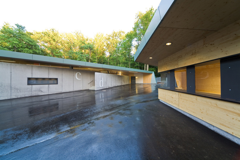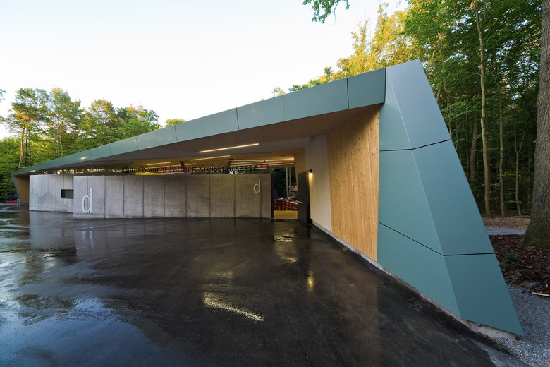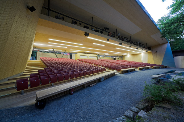 Die Zuschauerhalle mitten im Wald wurde ganz im Sinne der Bauherren „leicht, offen und modern“ gestaltet. In ihrer Bewegung symbolisiert die dynamische Bauform Wachstum und Veränderung – das Theater fügt sich als Teil der Waldlandschaft in die natürliche Umgebung ein. Die großzügige, selbsttragende Dachkonstruktion bietet rund 1.000 Sitzplätze für Theaterbesucher. Die grüne Färbung der Metallverkleidung verleiht der Konstruktion eine natürliche Anmutung. Schräg laufende Fugen in der metallenen Verkleidung folgen einer natürlichen (Un)Ordnung und greifen neben der Farbigkeit auch die Struktur des Waldes in der Fassade auf.