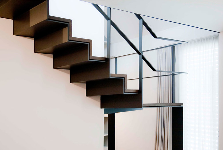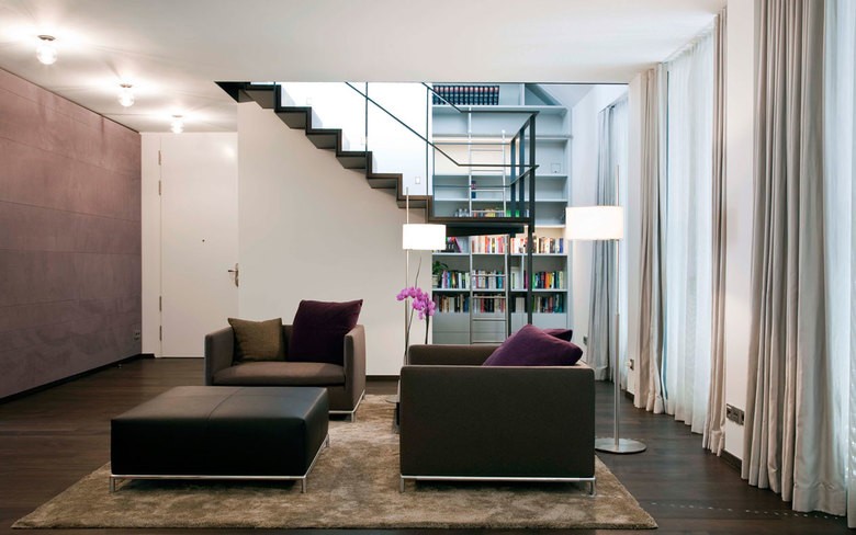 Der raumbildende Ausbau der Maisonette-Wohnung im 5. und 6. Obergeschoss von a+p Architekten verleiht mit dunklen, geölter Räuchereiche und warmtonigem, gelbem Juramarmor der Wohnung eine behagliche Eleganz. Textile Wandverkleidungen in einem matten Mauve -Ton begleiten Flure und Bewegungsflächen. Sie verbinden die beiden Ebenen zu einer formalen Einheit und schaffen auch in den sehr hohen Dachgeschossräumen eine wohnliche Raumakustik.
