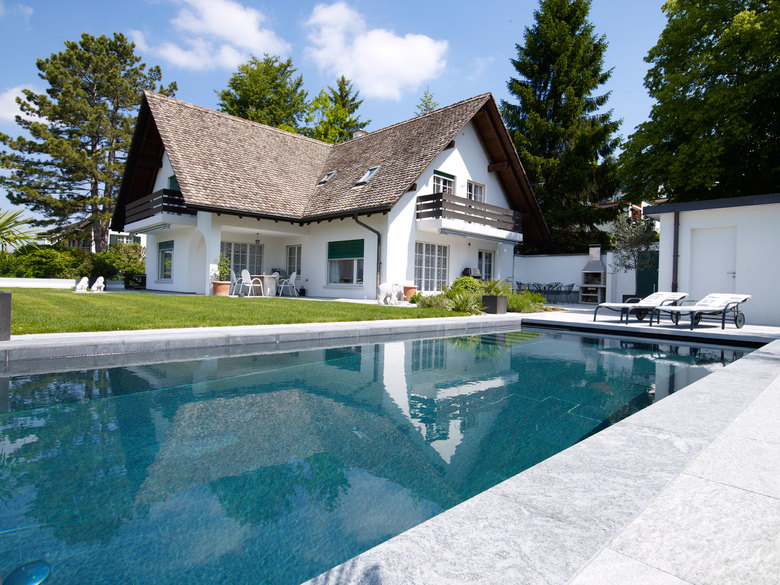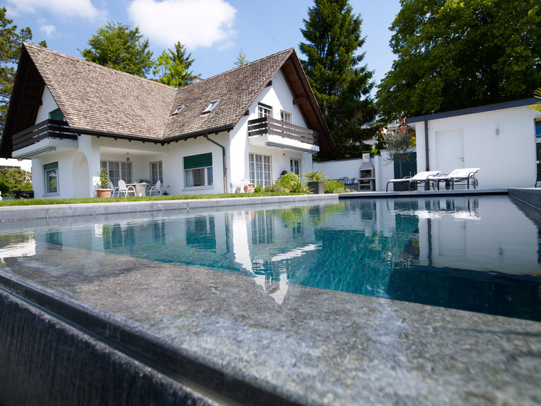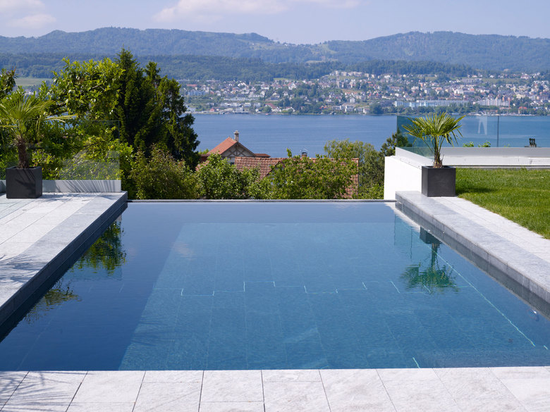 Dieses Schwimmbad vermittelt den Eindruck, als würde man direkt in den See hinein schwimmen. Dieses Gefühl wird durch die einseitige Überlaufrinne und die Position an Hanglage hervorgerufen.