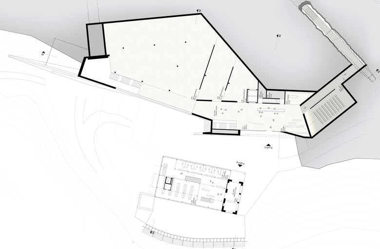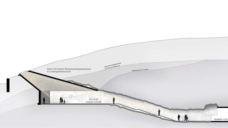Das bestehende Dokumentationsgebäude wird zukünftig als Bibliothek genutzt werden und ist im Untergeschoss, das durch die Hanglage natürlich belichtete Seminarräume birgt, mit dem Neubau verbunden.