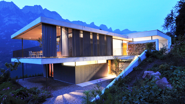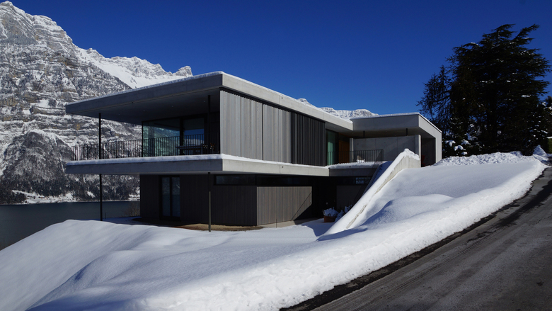 Der kleine Ort Murg befindet sich am südlichen Ufer des schweizer Walensees im Kanton St. Gallen. Das große, nach Norden hin abfallende Grundstück eröffnet dem Betrachter einen sensationellen Blick über den Walensee und die Schweizer Berge. So entstand hier ein Wohnhaus mit Hauptausrichtung nach Norden, welches dennoch Sonneneinstrahlung von Süden und Westen her erhält.