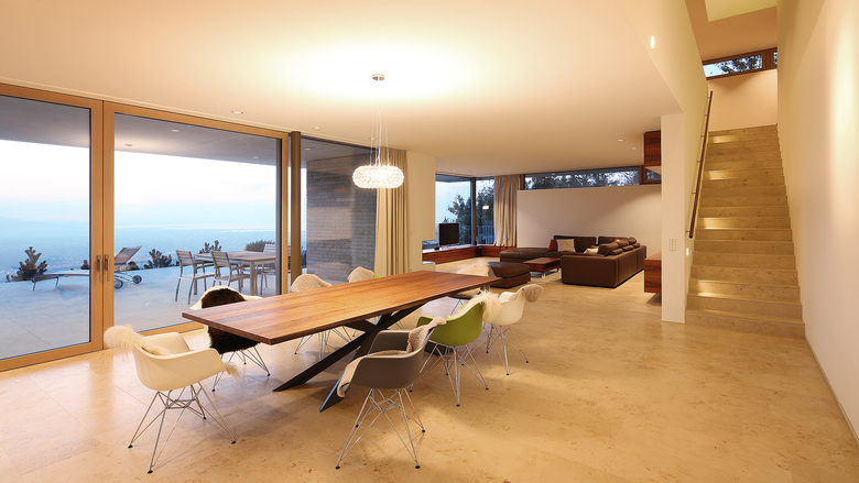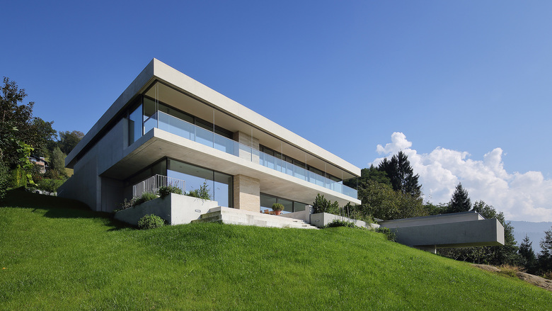 Das steile Grundstück Richtung Westen befindet sich oberhalb des Dorfkerns der Gemeinde Bildstein an einer kleinen privaten Zufahrtstraße. Dem Geländeverlauf folgend wurde das Haus in einen Schlaf- und einen Wohnbereich eingeteilt. Bewusst geschlossen präsentiert sich die Eingangshalle im Obergeschoß. Die nussholzfurnierte Wand auf der Galerie beinhaltet die Zugänge zu den privaten Zimmern des Bauherrn, sowie zu einem Gästetrakt im Süden. Von der Galerie im Obergeschoß führt die einläufige Steintreppe hinunter in das Wohngeschoß. Von hier aus eröffnet sich dem Besucher ein wunderbarer Blick über das gesamte Rheintal und den Bodensee. Ein offenes Wohnkonzept beinhaltet die Lebensräume Essen & Wohnen, der Kamin und das Wohnzimmer liegen auf der privateren Nordseite. Hier wurde auch keine raumhohe Glasfassade ausgeführt. Vielmehr wird der Blick Richtung Bodensee gerahmt durch die niedere Brüstungshöhe auf Sitzhöhe. Besonderes Augenmerk legte der Bauherr auf die Terrasse, hier ist der 13m lange, auskragende Pool der absolute Blickfang. Kein Geländer stört den Blick ins Tal, der umlaufende schmale Servicegang wurde so angelegt, dass er beim Schwimmen und auf der Terrasse nicht zu sehen ist: Wasseroberfläche und Himmel verschmelzen zu einer Einheit. Ebenso bleibt der Ausblick frei von Absturzsicherungen durch geschickt abgetreppte Pflanztröge aus Beton.