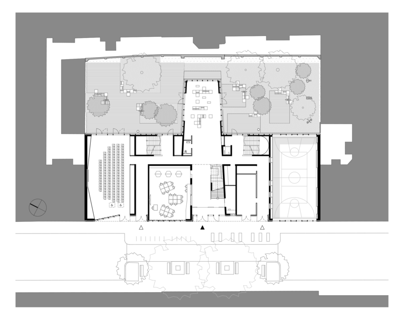 Das Einzige, was die neue Schule in der Embelgasse schließt, ist der Blockrand. Das Erdgeschoss gewährt dank großer Glasflächen Einblick in den Schulalltag und eröffnet dem Straßenraum den grünen Schulhof. Transparenz, Offenheit und Durchblick prägen den Außenauftritt der neuen Berufsschule. In den oberen Stockwerken werden wie in einem Setzkasten die schulischen Aktivitäten als Teil der Fassade und des Straßenraums präsentiert. So findet der enge Zusammenhang zwischen Öffentlichkeit und Verwaltung einen für beide Seiten bereichernden architektonischen Ausdruck. Über ein großzügiges, zweigeschossiges Foyer gelangen die SchülerInnen direkt zu den Klassenräumen, die im 2.Obergeschoss beginnen. Das Foyer holt Licht, Luft und Grün des Hofgartens ins Gebäude. Die Klassen sind zum Erschließungs- und Kommunikationsbereich transparent gehalten - ein Kontinuum Lern-, Arbeits- und Kommunikationsbereichen. Ergänzend zum grünen Innenhof nutzen die Schülerinnen die sonnige Hofterrasse im 2.Obergeschoss: Ein Freiraum liegt für die Schülerinnen jederzeit erreichbar in unmittelbarer Nähe.