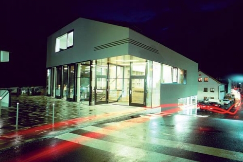 Ein starkes Implantat inmitten des traditionellen, hoch über dem Talboden gelegenen Dorfes. Der kleine, kompakte Bau an der Stelle eines alten Lagerhauses gibt eine heutige Antwort auf die kräftigen Altbauten der Nachbarschaft. Wie ein Fels durch Wind und Wasser, erscheint das grau geputzte Haus durch die Vektoren von Höhen- und Abstandsbestimmungen, Grundgrenzen und Funktionen nach allen Seiten kantig-kristallin geschliffen. Das Innere verblüfft durch offene Räume, vielfältige Durch- und Ausblicke. Auf dem windschiefen Hang ist der freistehende Bau an vier verschiedenen Stellen mit den Außenniveaus verbunden: Tourismusinfo, Café, Mehrzwecksaal und Ausstellungsraum haben separate Eingänge. Intern können die gestaffelten Ebenen variabel kombiniert, aber auch zu einem einzigen Großraum zusammengeschaltet werden.