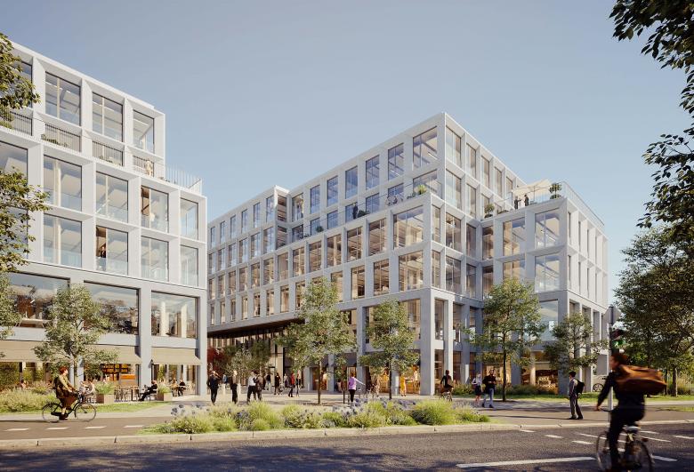 Vier Baukörper werden durch Einschnitte und Zäsuren gegliedert und durch Abstufungen in den oberen Geschoßen sowie eingangsbildenden Rücksprüngen weiter differenziert.
