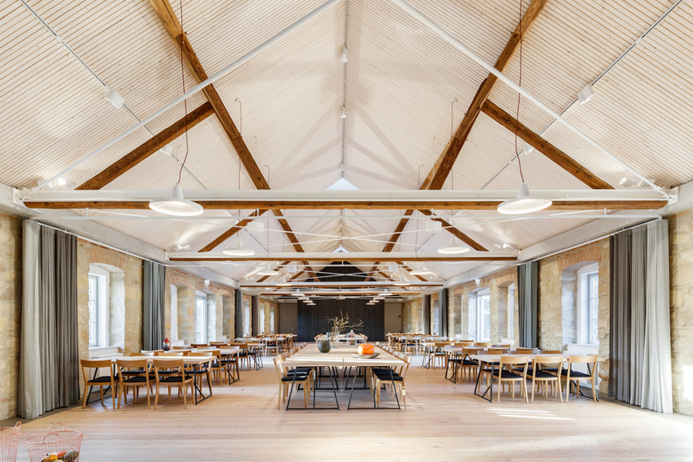 Entstanden ist eine spannungsvolle Collage aus bestehenden und neuen Materialien, die einen anregenden und behaglichen Rahmen für Veranstaltungen aller Art bietet.