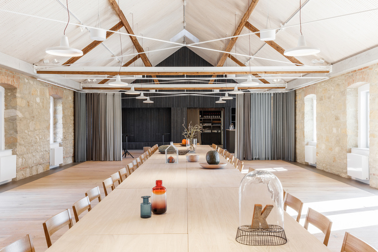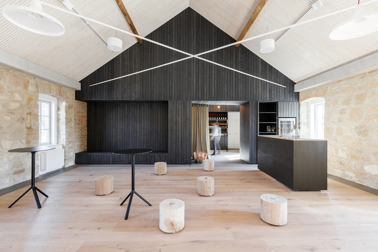 Das Gesindehaus wird zum Festsaal – In der Nähe von Eisenstadt im Burgenland, hinter dem Weingut Esterházy, liegt der historische Meierhof Trausdorf. Bis vor kurzem dämmerte dieser in einer Art Dornröschenschlaf zwischen landwirtschaftlicher Nutzung und Verfall vor sich hin. 2012 schrieb die Stiftung Esterházy einen Wettbewerb - den AllesWirdGut gewann - zur Umnutzung des Ensembles aus. 2015 wird die erste Etappe der Revitalisierung in Angriff genommen: Das ehemalige Gesindehaus wird von AllesWirdGut (Architektur), sowie Mobimenti (Inneneinrichtung) zu einem Festsaal für das benachbarte Weingut umgebaut.