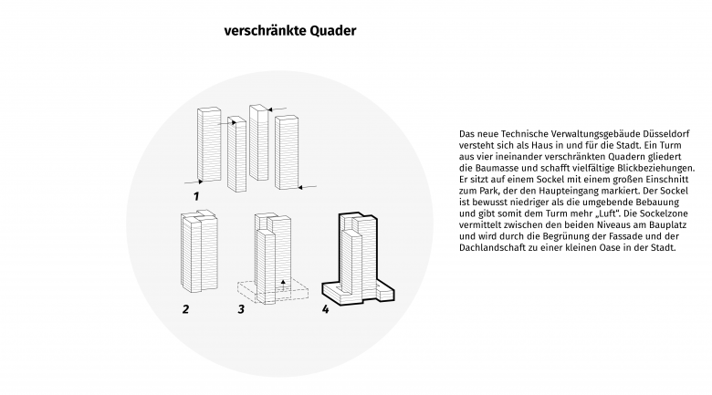 Der Entwurf für den Neubau des Technischen Verwaltungsgebäudes Düsseldorf von AllesWirdGut und Hertl.Architekten gründet auf einer durchlässigen öffentlichen Sockelzone und gliedert die in der Ausschreibung geforderte große Baumasse in einen schlanken Turm aus vier ineinander verschränkten Quadern.