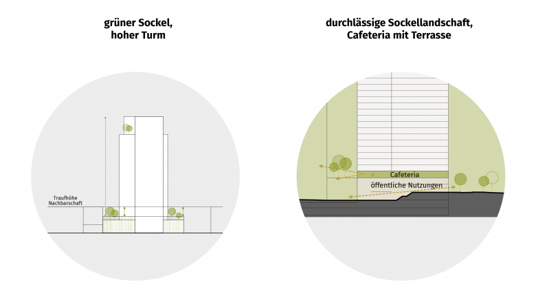Der grüne Sockel versteht sich als orientierunggebendes Raumkontinuum zwischen Moskauer Straße und IHZ-Park, das durch seine offene Gestaltung eine intuitive Verbindung der beiden Niveaus schafft. Ein Einschnitt in diesem in Relation zu den umliegenden Häusern bewusst niedriggehaltenen Bauteil markiert den zum Park hin orientierten Haupteingang. Die intensive Begrünung von Fassade und windgeschütztem Sockelzonendach laden zum Durchqueren und Verweilen in der kleinen Stadtoase ein.