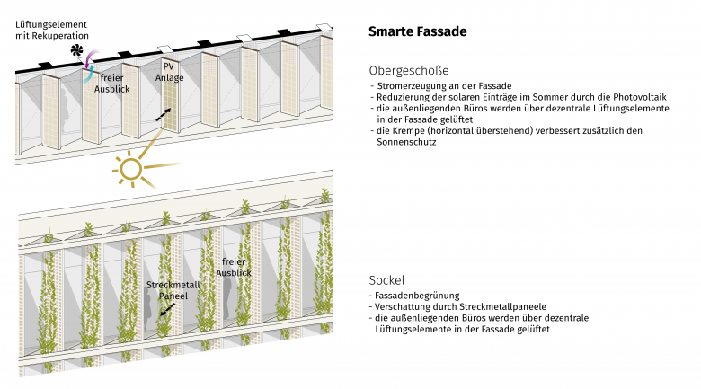 hohen Vorfertigungsgrad und kurze Transportwege eine ressourceneffiziente Lösung dar. Die individuell entwickelte Zickzackfassade mit Photovoltaik- und dezentralen Lüftungselementen kombiniert passive Verschattung im Sommer und solare Energiegewinnung im Winter. Das Begrünungskonzept für das Technische Verwaltungsgebäude sieht klimaresiliente und windresistente Baumarten genauso wie farbenintensive Gräser und dichtwachsende Kletterpflanzen vor und verschränkt das Gebäude von Hof bis Dachterrasse mit seiner Umgebung. Entlang der Erdgeschoßzone spannt sich der Freiraum von der Moskauer Straße bis zum Park und öffnet sich dort zu einem großzügigen öffentlichen Platz mit Aufenthaltsbereichen, Wasserspielen und lockeren Baumgruppen.