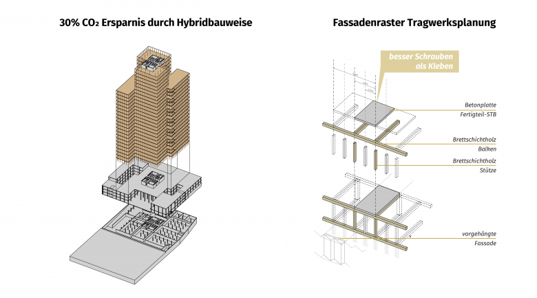 Oberhalb des Sockels befinden sich ein Konferenzzentrum, die technischen Abteilungen sowie die (eigens erschlossene) Verkehrs- und Tunnelleitzentrale. Als Verpflegungs- und Erholungsbereiche verbinden die darüberliegenden Geschoße – eine Cafeteria mit großer Terrasse und eine Work-Life-Balance-Ebene – die öffentlichen Zonen mit den Büroetagen. Diese strukturieren sich in jeweils zwei flexibel nutzbare Büroeinheiten (Business Clubs), die um dreigeschoßige Wintergärten und Meetingräume kreisen. Das Klima- und Energiekonzept des Gebäudes sieht die Nutzung lokaler Potenziale aus regenerativen Quellen mittels Photovoltaikanlagen, Regenwasserspeicher, Betonkernaktivierung, Geothermie sowie ergänzender Nahwärme und -kälte vor. Ebenfalls im Sinne der angestrebten positiven Gebäudebilanz werden sämtliche Ebenen des Turms als Holz-Beton-Tragwerk ausgestaltet. Auch die Hybridbauweise der Decken stellt durch einen