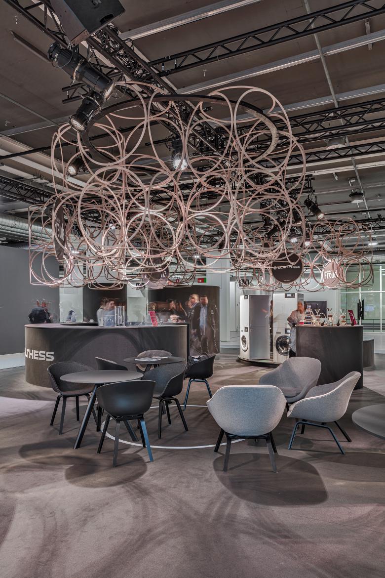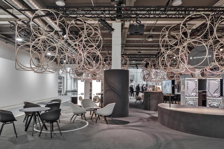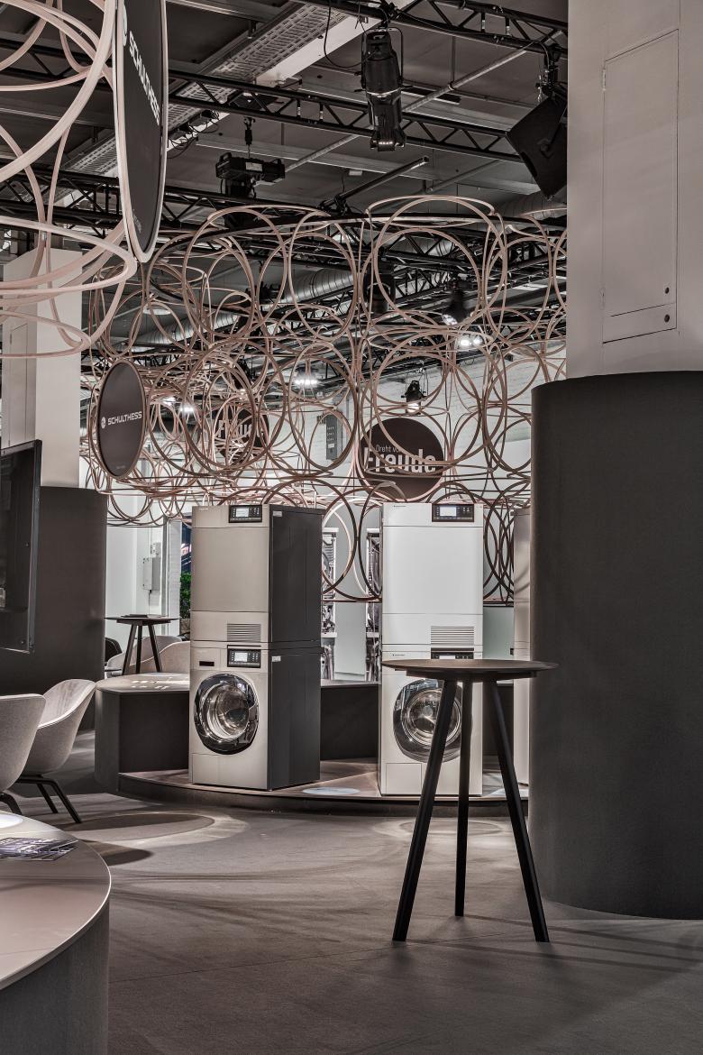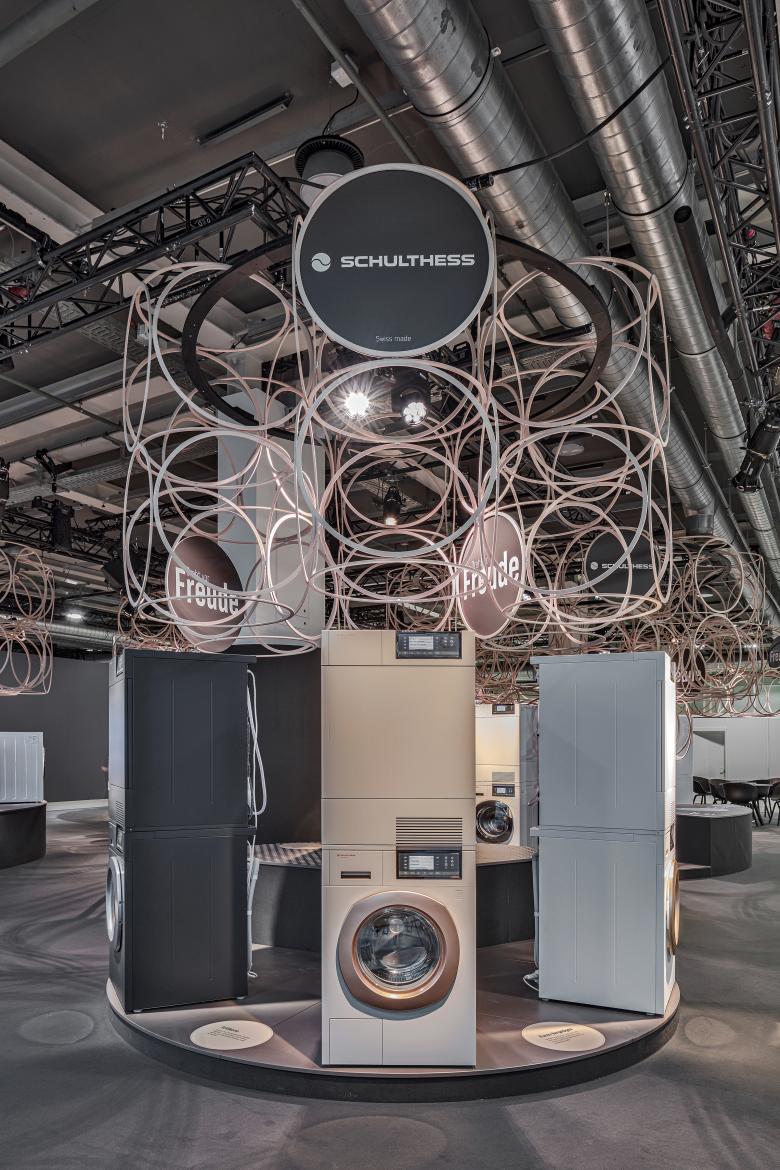 An der grössten Fachmesse der Bau- und Immobilienwirtschaft der Schweiz, der Swissbau in Basel, ist der Waschpionier Schulthess mit einem besonders runden Konzept aufgefallen. Die Idee «Dreht vor Freude» wurde hierbei zum Dreh- und Angelpunkt der Installation: Der Stand überraschte mit aufgehängten Hula-Hoop-Reifen, welche die Drehungen für die Besucher visuell erlebbar machten. Unterstützt wurde die Szenografie durch eine Lichtinstallation, welche zusätzlich die Schatten der imposanten Holzring-Installation zum Drehen brachte. Die Maschinen wurden auf voluminösen runden Podesten präsentiert, umrahmt von einer reduzierten Linienführung. Entstanden ist eine durchweg stilvolle und hochwertige Wohlfühlumgebung, die sowohl der Marke Schulthess wie auch ihren erstklassigen Produkten stimmig Rechnung trägt.