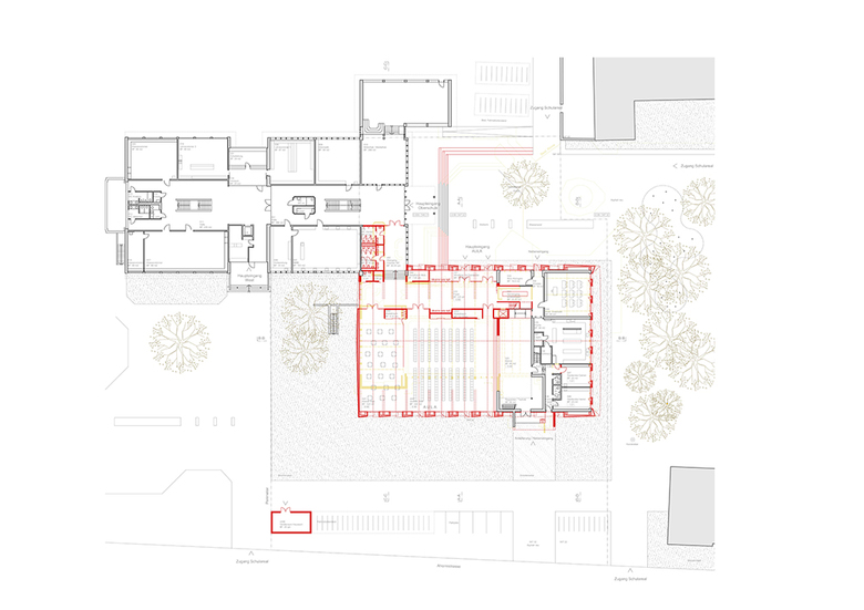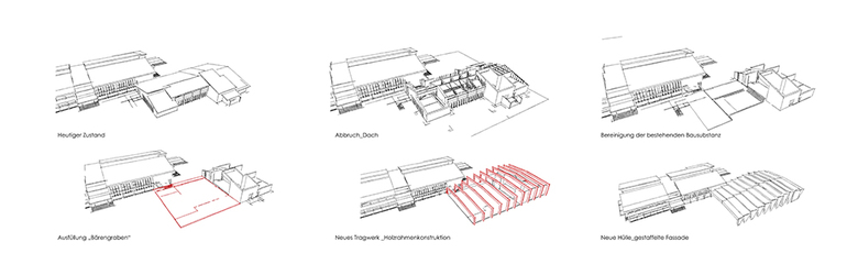 Die vorhandene Struktur im Bereich der heutigen Aula ermöglicht keine befriedigende räumliche Erweiterungsmöglichkeiten. Zudem ist die bestehende Hülle inklusive den Fenstern in weiten Teilen sanierungsbedürftig und entspricht nicht den heutigen Anforderungen. Im Sinn eines nachhaltigen und klärenden Eingriffs, werden die statischen Strukturen im Bereich der heutigen Aula entfernt, die Vertiefung aufgefüllt und der Boden wo nötig ergänzt