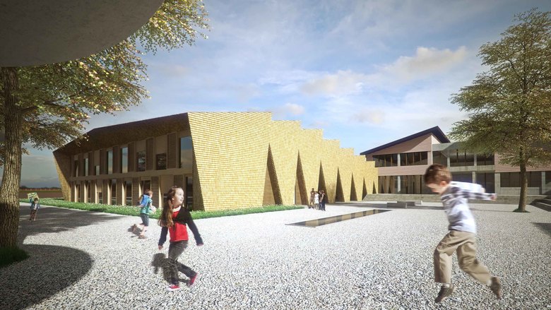 Das Projekt vereinigt die geforderten Nutzungen unter einer Hülle und schafft damit ein neues klares Volumen und Identität. Die Strukturierung und Gestaltung der Fassade leitet sich aus den unterschiedlichen Anforderungen der Aula ab. Der gestaffelte Längsschnitt wird hergeleitet aus der optimalen Belichtung und eines raumakustisch guten Volumens. Das Trägerquerprofil bildet die Statik und integriert die Leitungsführung der Haustechnik.