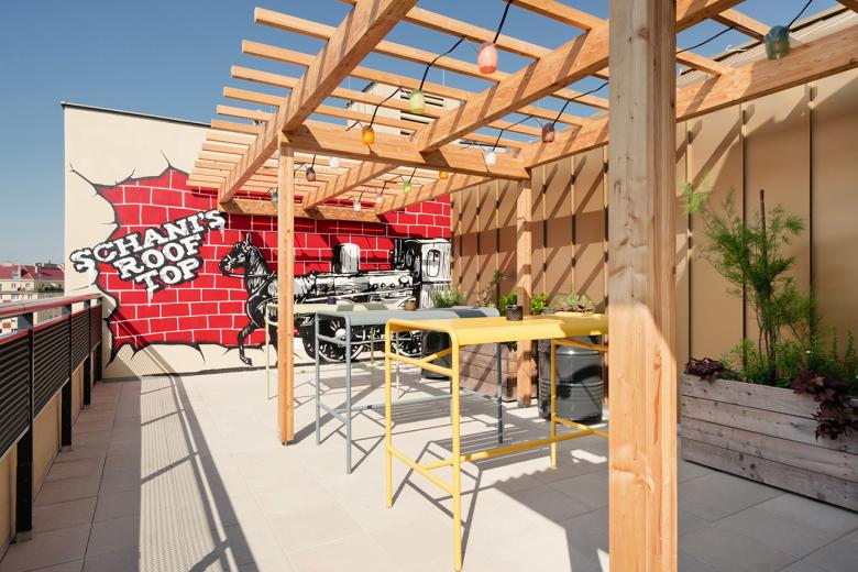 On the terrace with its leafy pergola, nature is the designer: a breathtaking view over the Vienna Arsenal and the Sonnwendviertel enchants guests here.