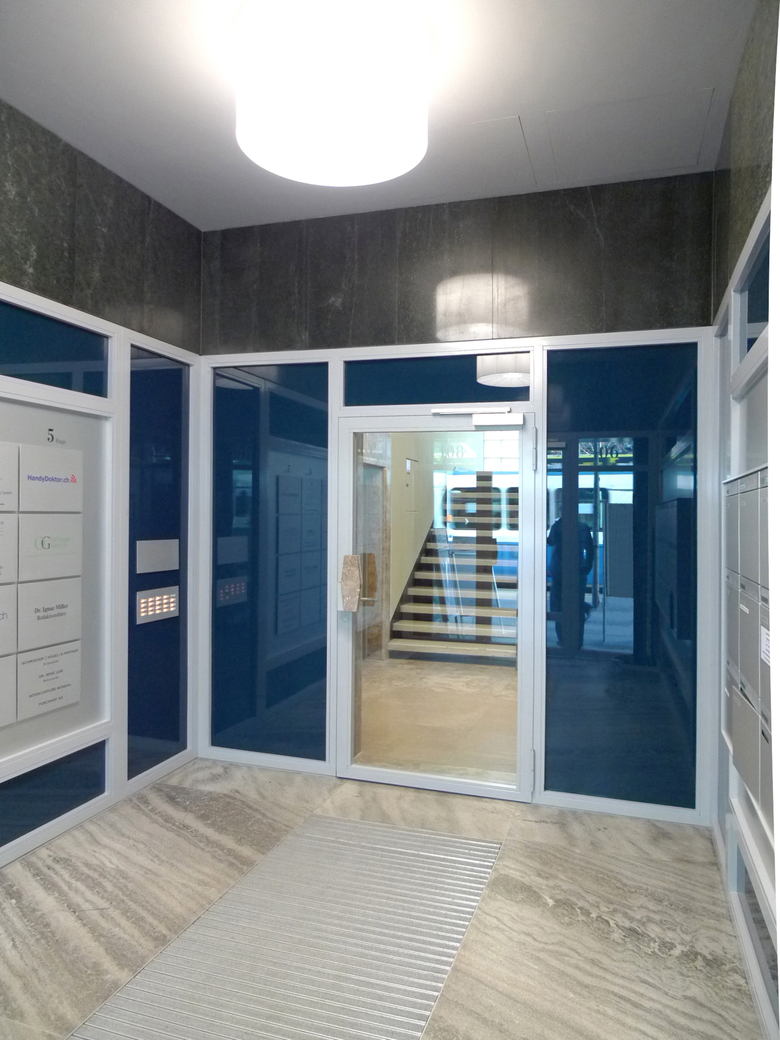 Ein strategisches Ziel des Projektes war es, das Geschäftshaus von den benachbarten Läden zu differenzieren und als eigenständige Adresse an der Bahnhofstrasse auszubilden. Die neuen Eingangstüren, die Briefkastenanlage und die Mieteranschrifttafel fügen sich zu einem Band, das sich um den Raum zieht und ihm einen repräsentativen Charakter verleiht. Dieser wird zusätzlich von den prägnanten Deckenleuchten sowie der mittig auf dem Boden platzierten Sauberlaufzone betont. Das Treppenhaus wird durch die für die 50er Jahre typischen Treppenläufe geprägt und weist somit eine starke eigene Identität auf. Da wurde nur subtil eingegriffen, um die ursprüngliche Raumwirkung wieder zur Geltung zu bringen. Durch das überarbeitete Farbkonzept wurde eine neue Atmosphäre geschaffen.