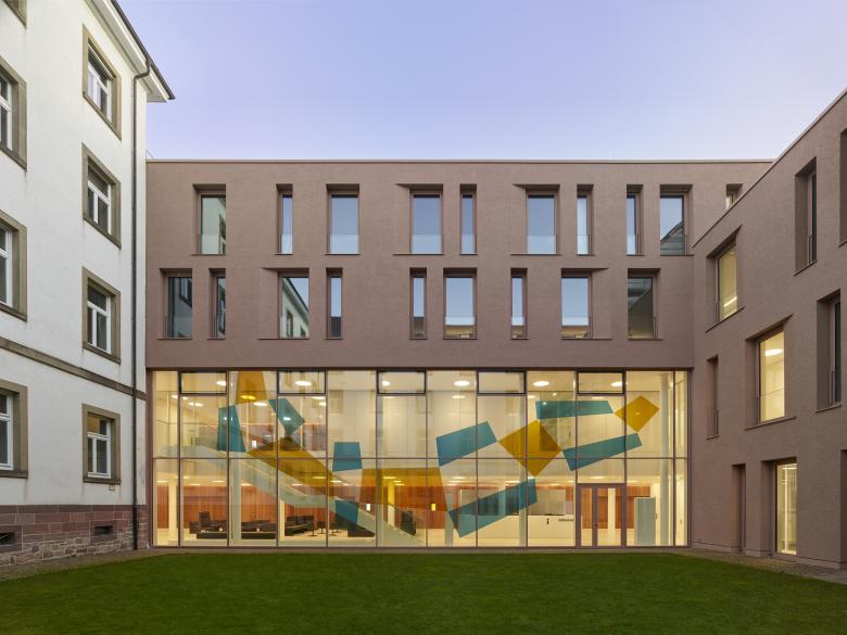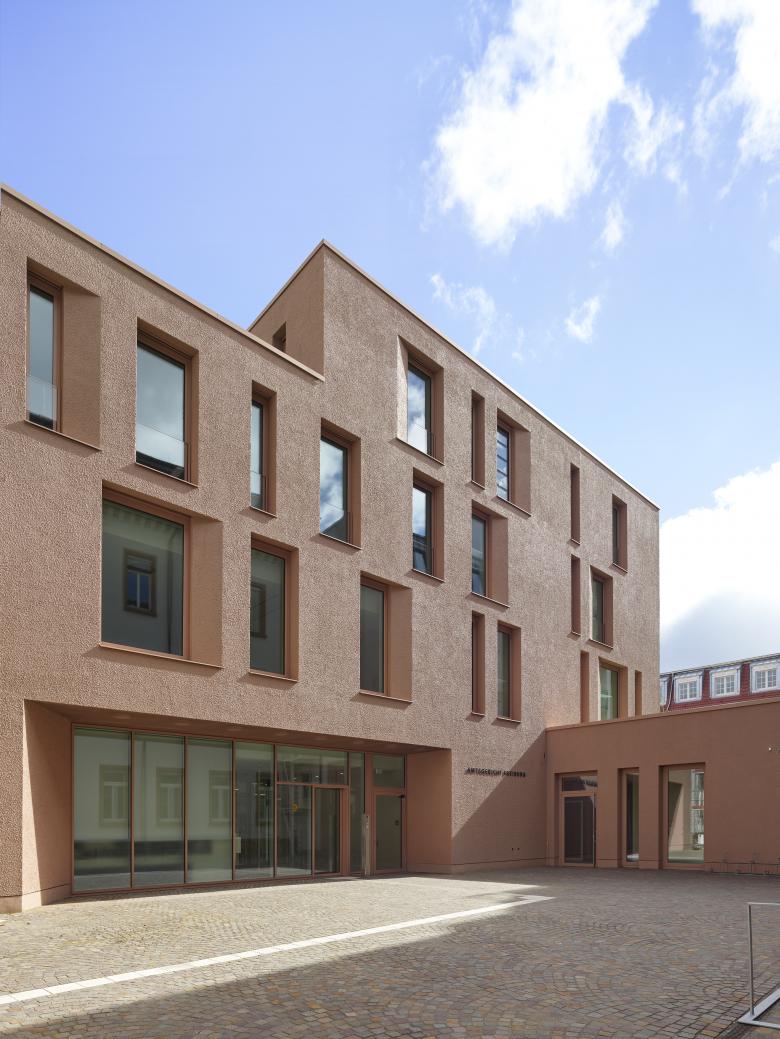 Der Erweiterungsbau des Amtsgerichts Freiburg dient als neues Empfangsgebäude, das im Hof einer denkmalgeschützten Blockrandbebauung fließende Übergänge zwischen Alt und Neu ermöglicht. Ein maßstäbliches Bauvolumen und die grobkörnige porphyrrote Putzfassade mit tief eingeschnittenen Wandöffnungen fügen den Neubau harmonisch ins historische Umfeld ein.