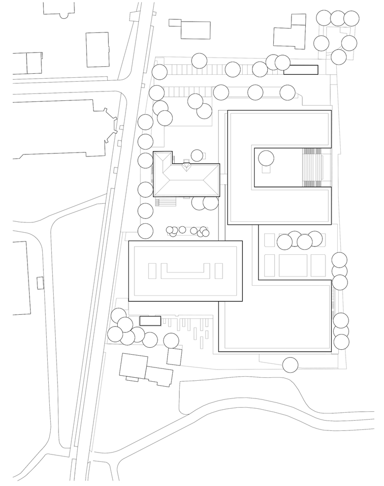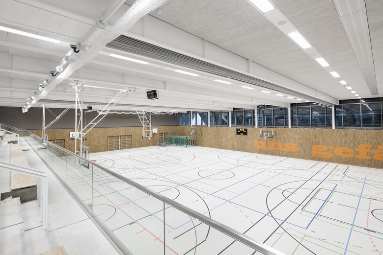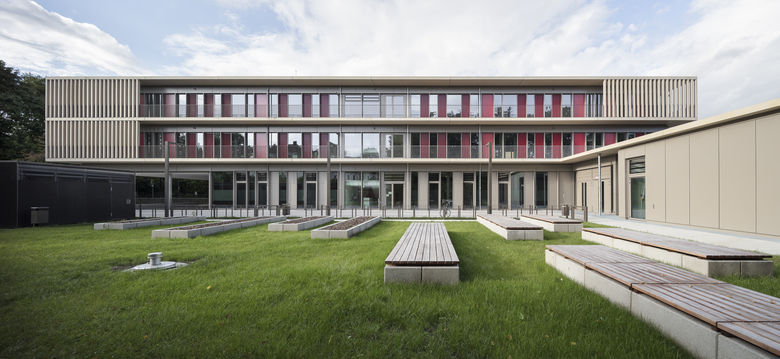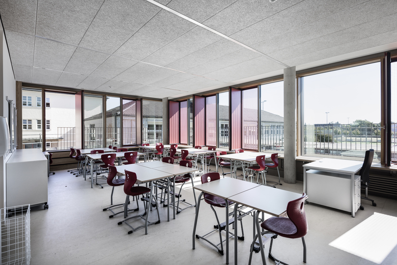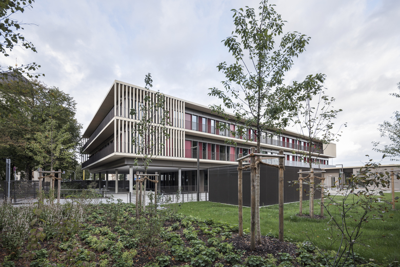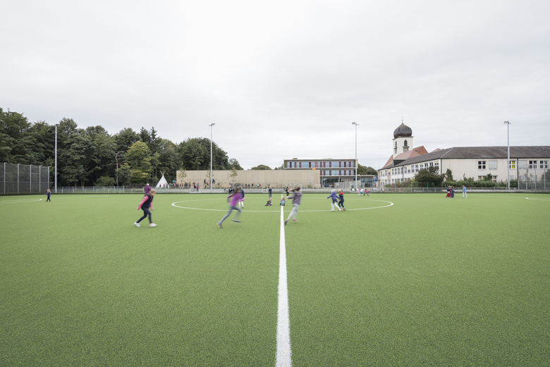 Die bestehenden Schulgebäude aus unterschiedlichen Entstehungszeiten wurden bis auf den aus dem Jahr 1912 stammenden Hauptbau gegenüber der Kirche Leiden Christi abgerissen und durch Neubauten ersetzt, die neben der Grund- und der Realschule eine Dreifachsporthalle umfassen. Verbindendes Element der neuen Schulanlage ist eine erdgeschossige Erschließungsgshalle, an die zu beiden Seiten sowohl die Schulhäuser, die Mittagsverpflegung als auch die Sporthalle anschließen. Dadurch entstehen neben einem großzügigen Eingangshof geschützte und zum Teil über zwei Ebenen reichende Pausenhöfe.