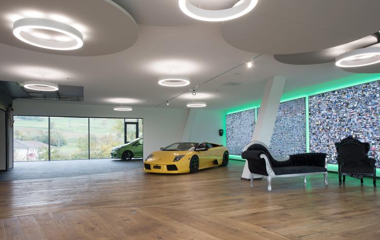 Beheizt wird nur das erste Obergeschoss. Hier sind wunderschöne Ausstellungsräume entstanden in denen ein Büro, eine kleine Küche, eine Bar und eine Lounge untergebracht sind. Die Kundschaft kann ihren neuen Wagen direkt in der Lounge in Empfang nehmen. Im Lounge-Bereich ist zudem eine grosse Drehbühne eingebaut. Der darauf präsentierte Wagen ist – zusammen mit den anderen Ausstellungsmodellen im 1. OG – auch von aussen zu sehen, denn das Geschoss ist auf drei Seiten vollständig verglast. Wenn es draussen dunkel ist, zieht der beleuchtete Showroom und das Beleuchtungskonzept der Fassaden am Dorfeingang die Blicke auf sich.