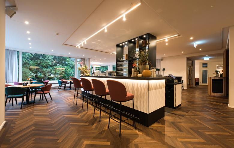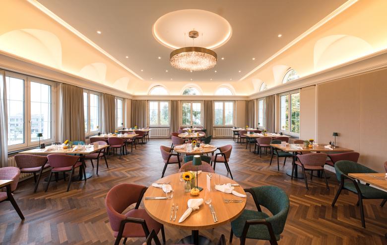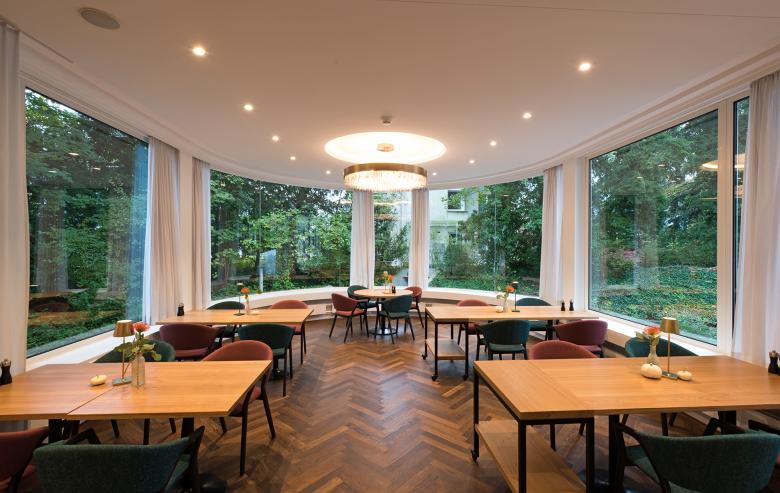 Ein Beispiel für das Zusammenspiel zwischen Natur und Einrichtung ist das neu gestaltete Restaurant mit seinen grünen und roten Stühlen, den gelb changierten Tapeten sowie Tischen aus Holz. Die Möbel und Tapeten nehmen farblich die Natur des Parks auf, der durch die grossen Glasfassaden zu sehen ist. Die Zimmer in den Obergeschossen zeichnen sich durch aufgefrischte Oberflächen, modernisierte Bäder und eine neue Möblierung aus. Ein neues Beleuchtungskonzept sorgt für die angemessene Beleuchtung der Räume und für differenzierte Stimmungen.